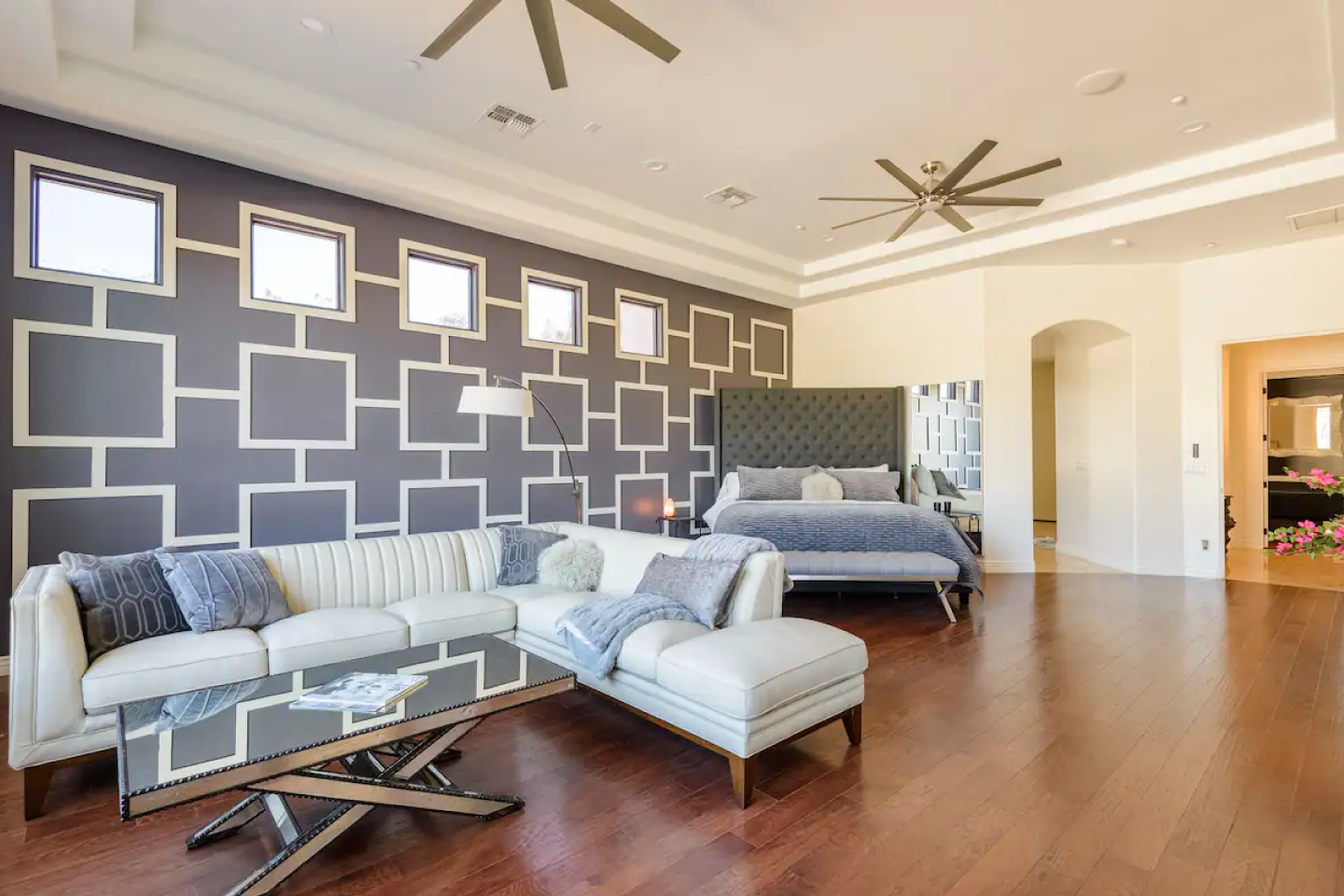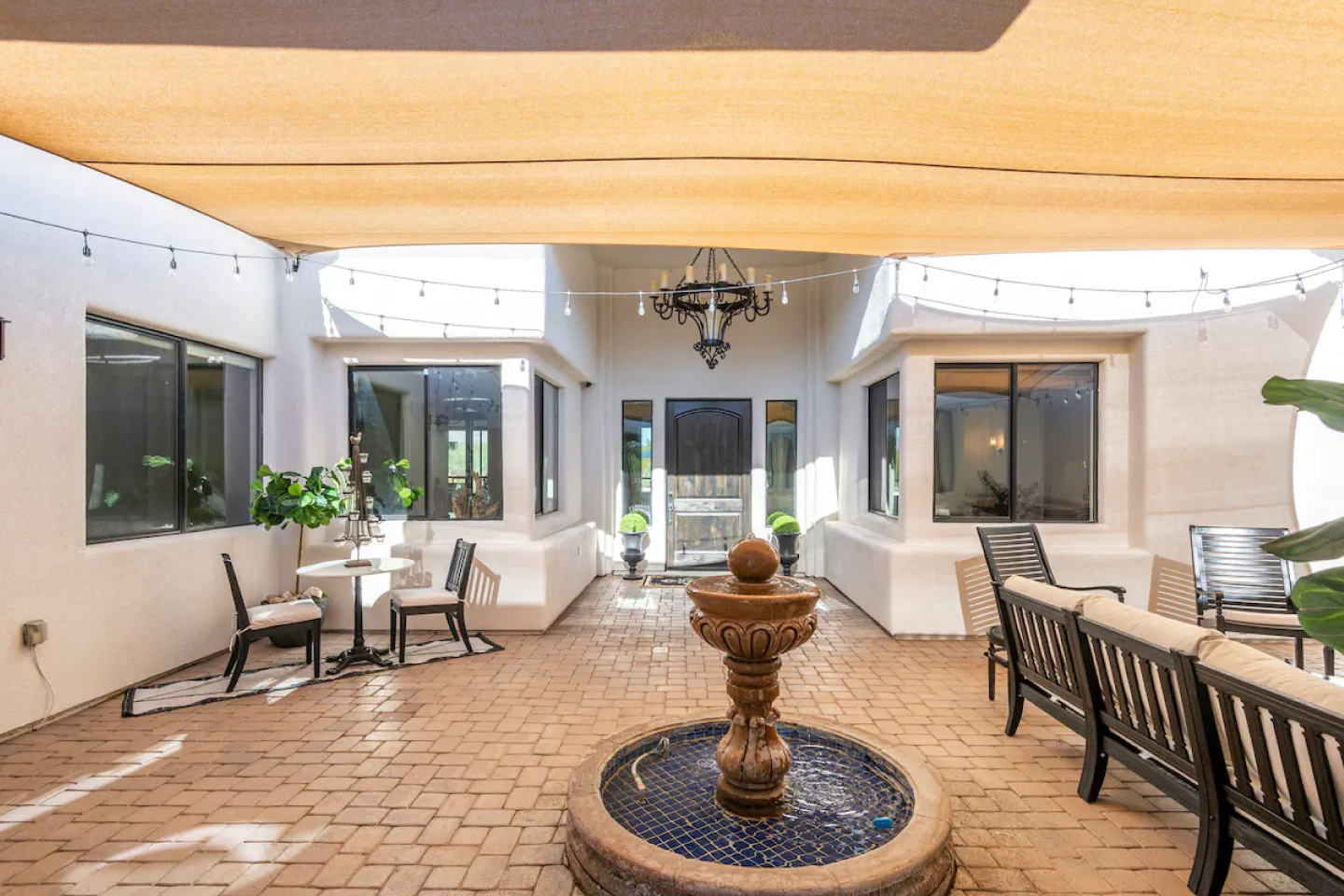 Nearly 800 sq ft with expansive windows inviting one to enjoy the pool, desert, and mountain views. Beautiful ensuite with walk-in travertine snail shower and jacuzzi bath. Spacious and private with separate entrance/exit to the Arizona room and outside. $3,790 USD