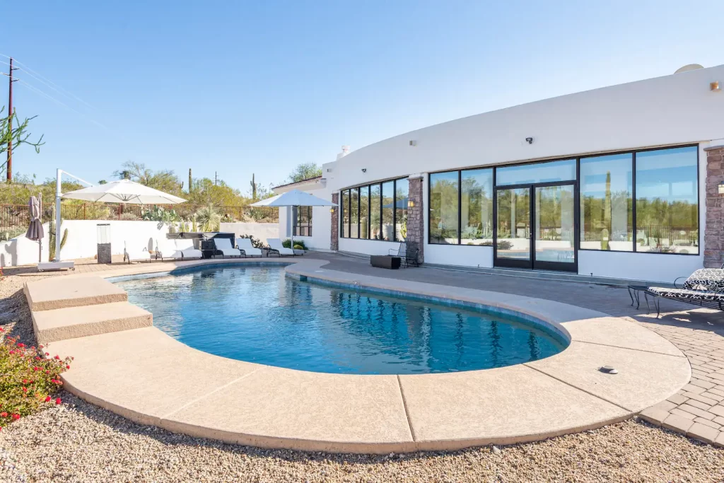 Nestled against the stunning backdrop of the Sonoran McDowell Mountain Preserve, “The Mission” is a pristine estate that showcases a distinctive Spanish mission aesthetic. Its exterior exudes charm, while the interior boasts contemporary design complemented by sleek, modern furnishings and decor. Unique artistic elements add character throughout the space. With soaring ceilings, every room offers an airy ambiance, inviting you to explore what’s next. Whether indoors or outdoors, this estate provides a beautiful setting for the elevated vacation experience you deserve. Set on 2.6 acres of tranquil desert landscape, it offers breathtaking views of both the desert and the mountains.